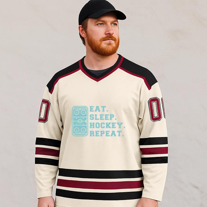Bring the arena energy wherever you go with our Eat Sleep Hockey Repeat Quote Cut Out Hockey Jersey Hockey Jersey. Designed with a breathable athletic fit, durable stitching, and classic team-style details, this jersey offers both comfort and performance for sports or everyday wear.