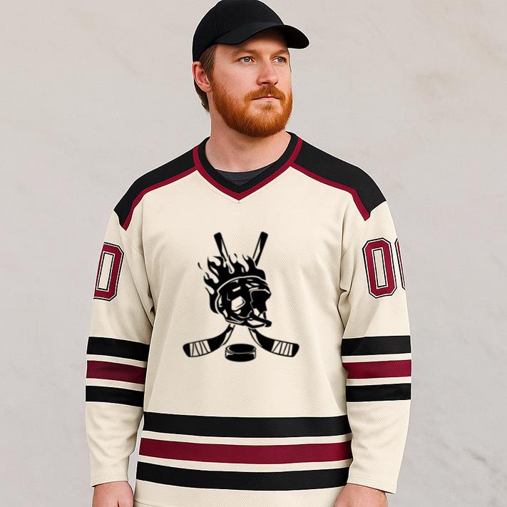 Our Hockey Helmet On Fire And Sticks Badge Hockey Jersey Hockey Jersey captures the authentic look and feel of classic rink uniforms while offering everyday comfort and style. Made from a durable polyester mesh blend, this jersey is lightweight, breathable, and designed for unrestricted movement — ideal for both athletes and fans alike.